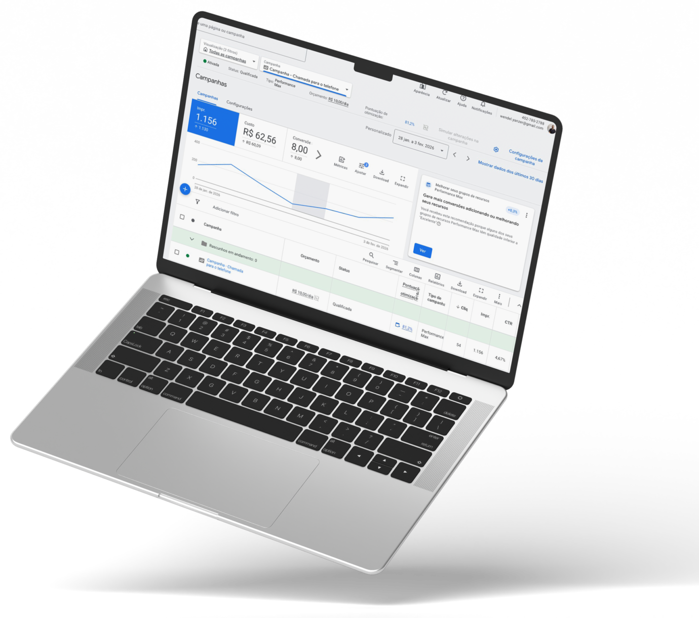 Colocamos as campanhas no ar e acompanhamos diariamente métricas como CPC, CPL, CPA e ROI.